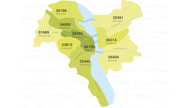В зависимости от района, стоимость недвижимости на первичном рынке Киева колеблется от 23,8 тыс. гривен до 66,7 тыс. гривен.