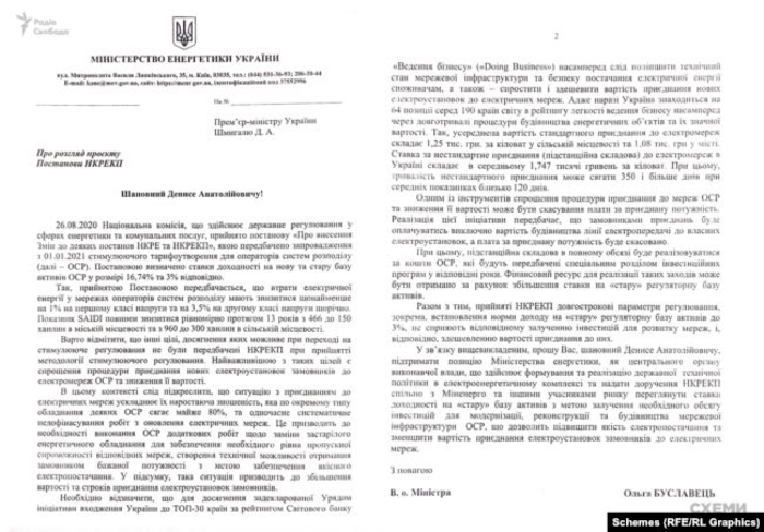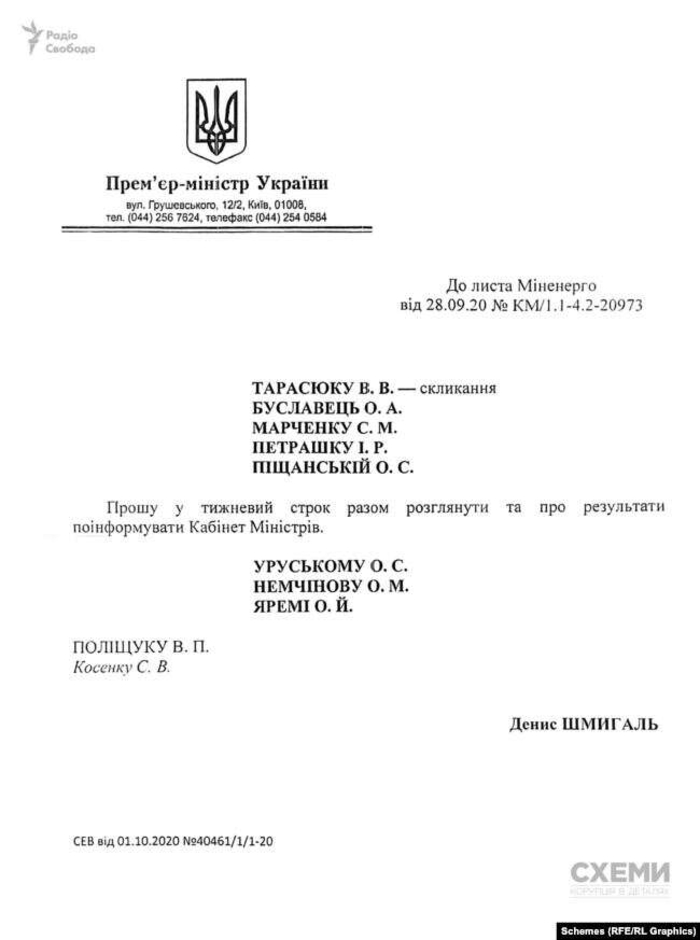 1 октября премьер-министр Денис Шмыгаль дал поручение в недельный срок рассмотреть письмо министра энергетики и о результатах проинформировать Кабинет министров. Об этом говорится в письме за подписью Шмыгаля на руководителей ряда профильных органов власти, которое приводят журналисты «Схем».