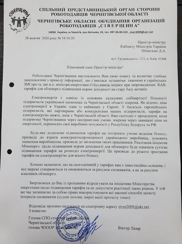 Представители бизнеса в Черниговской области обратились к премьер-министру Украины Денису Шмыгалю с просьбой не допустить реализации инициативы и.о. министра энергетики Ольги Буславец по повышению нормы доходности на старую базу активов при внедрении RAB-регулирования. Такая инициатива, по их мнению, приведет к значительному повышению расходов бизнеса, что в свою очередь, повлияет на цены.