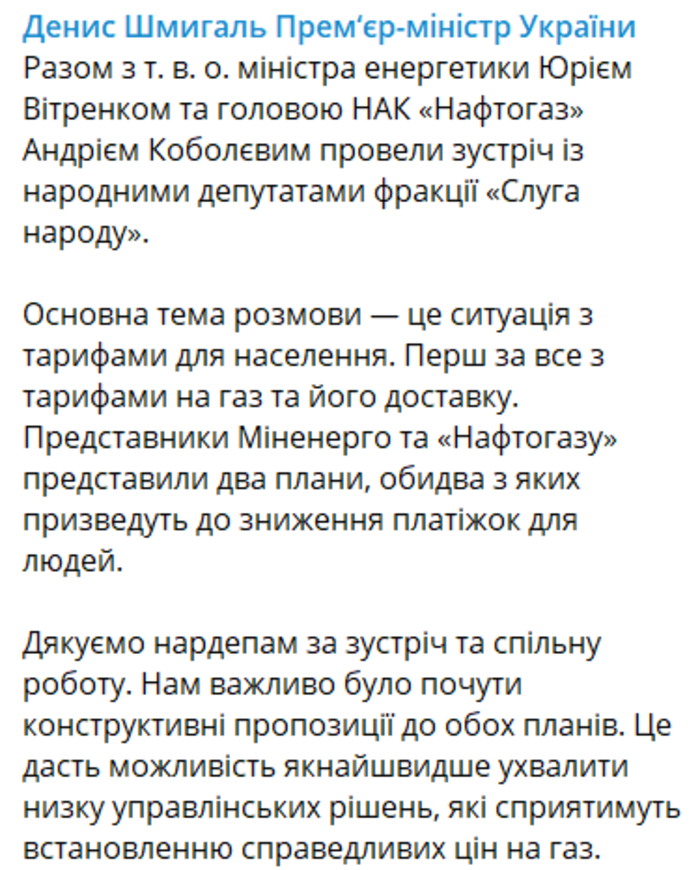 Основная тема разговора - это ситуация с тарифами для населения. Прежде всего с тарифами на газ и его доставку. Представители Минэнерго и Нафтогаза представили два плана, оба из которых приведут к снижению платежек для людей - подчеркнул премьер