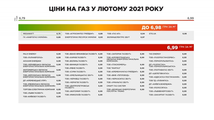 В Украине уже почти все газоснабжающие компании, которые присутствуют на рынке газа, опубликовали ценники на февраль 2021 года. Большая часть компаний продает газ по максимально определенной государством цене - 6,99 грн/кубометр, однако есть и те, кто установил меньшую цену.
