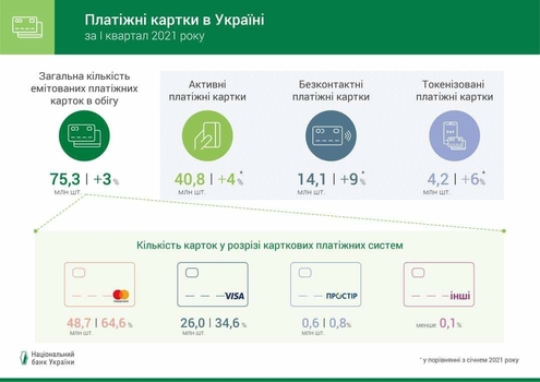 Кроме того, с начала 2021-го значительно увеличилось количество бесконтактных банковских карт — на 10% до 14,1 млн шт. Также в Украине набирают популярности токенизорованые карты. Их количество уже достигло 4,2млн. штук, что на 6% превышает показатель в начале года.