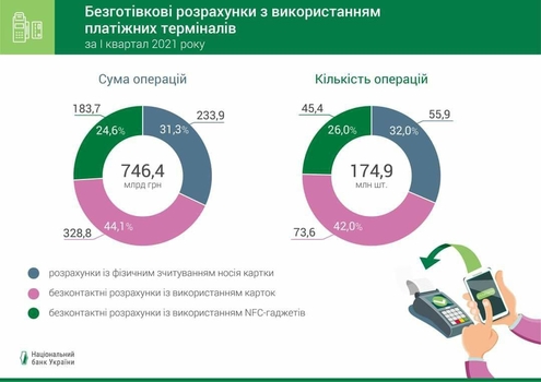 Регулятор также сообщил, что в Украине активно расширяется инфраструктура для безналичных расчетов. Количество точек продаж, которые принимают платежные карты, с начала 2021 выросло на 2% - до 333,5. Также за первые три месяца текущего года сеть торговых pos-терминалов выросла почти на 2% — до 382 тыс.