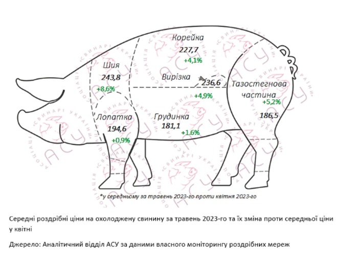 "Приріст цін на окремі свинячі частини не був однорідним у травні. Найпомітніше подорожчав сезонно популярніший ошийок (+8,6% проти середньої квітневої позначки), стейк (+6,4%) та тазостегнова частина (+5,2%). Водночас бюджетніші лопатка та грудинка зросли в ціні незначно, додавши 0,9% та 1,6% відповідно", - розповіли в АСУ.