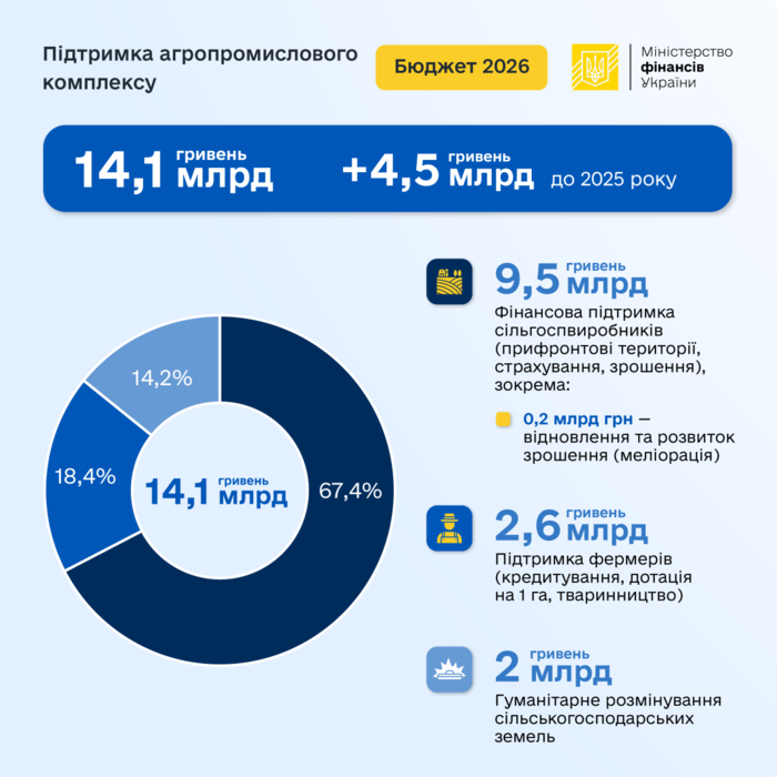 У Державному бюджеті України на 2026 рік уряд посилює підтримку агропромислового комплексу - одного з ключових секторів української економіки та гаранта продовольчої безпеки. Загальний обсяг фінансування становить 14,1 млрд грн, що на 4,5 млрд грн більше порівняно з 2025 роком. Про це пишуть Dengi.ua з посиланням на пресслужбу Міністерства фінансів.