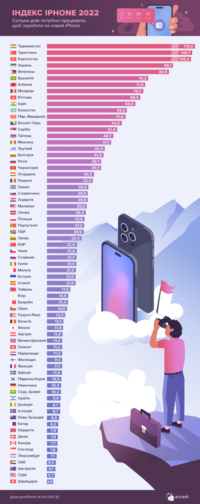 У рейтингу країн найгірший результат показав Таджикистан, де громадянин зможе дозволити iPhone після відпрацювання 179,5 днів. Друге та третє місце з кінця посідають Туреччина та Киргизстан із результатами 146,7 та 136,3 відповідно.