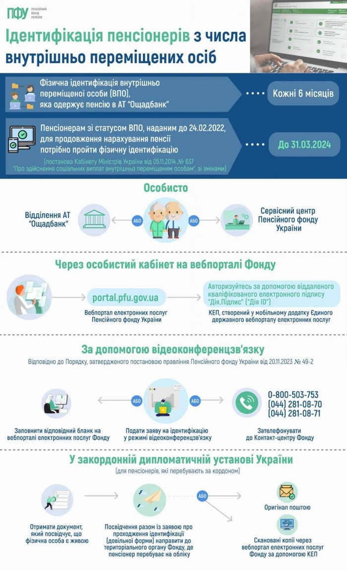 Постановою уряду від 08.08.2023 №837 передбачено, що для отримання виплат у 2024 році особи з числа ВПО мають пройти ідентифікацію в АТ "Ощадбанк" або в органах Пенсійного фонду України.