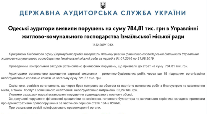 У виданні відзначили, що за дивних обставин аудитори не побачили порушень на декілька сотень мільйонів бюджетних коштів, і тому міська влада Ізмаїла продовжила закупівлі за такою ж схемою.