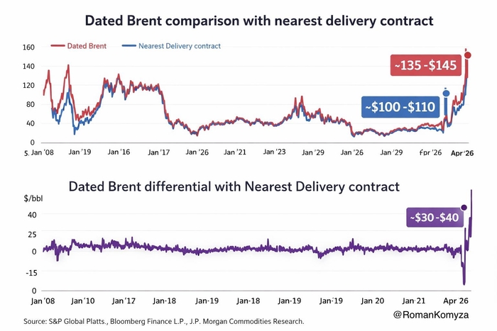Фізичні ціни на нафту Dated Brent на початку квітня 2026 року досягли $130-$140 за барель. При цьому червневі ф'ючерси на ту саму марку "чорного золота" продавалися в районі $100 за барель. Про це у своєму авторському блозі на Dengi.ua розповів економіст і голова ради Центру економічної інтеграції та сталого розвитку Роман Комиза.