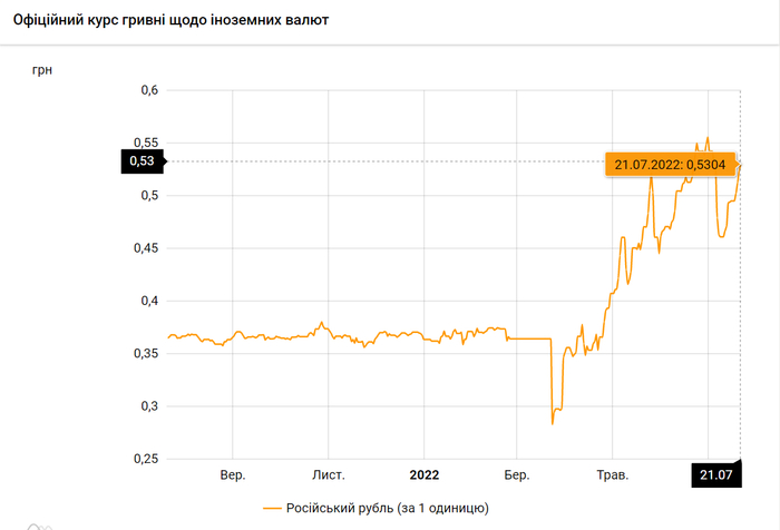 - 100 російських рублів – 53,0 грн. (5,30 за 10 рублів, +6 коп.)