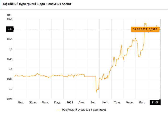 - 100 російських рублів – 59,9 грн. (5,99 за 10 рублів, 0 коп.)