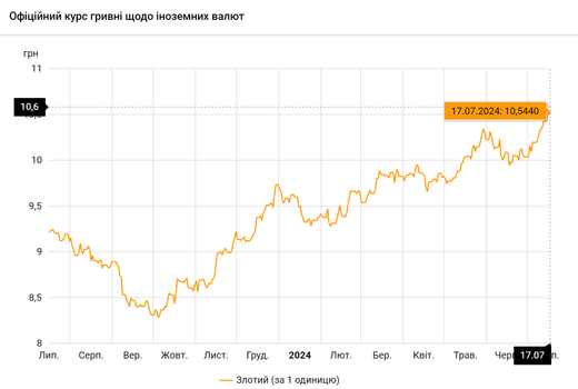 - 100 польських злотих – 1054 грн. (10,54 за злотий, +3 коп.)
