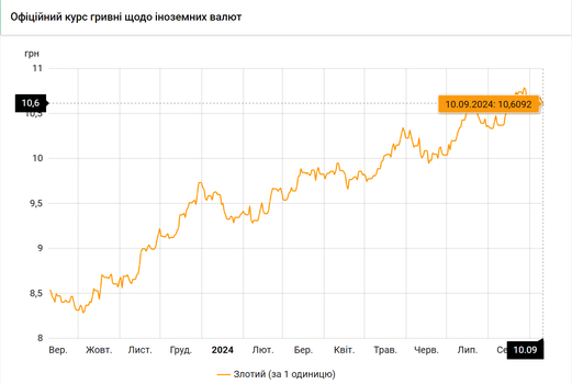 - 100 польських злотих – 1060 грн. (10,60 за злотий, -4 коп.)