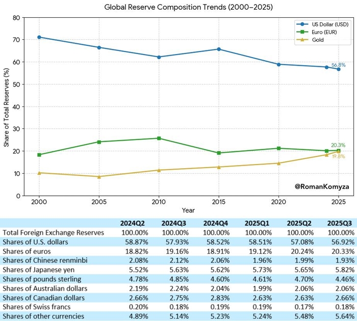 За даними МВФ за IV квартал 2025 року, долар США становить приблизно 56,8% світових валютних резервів, що є найнижчим показником з 1994 року. Про це у своєму авторському блозі на Dengi.ua розповів економіст і голова ради Центру економічної інтеграції та сталого розвитку Роман Комиза.