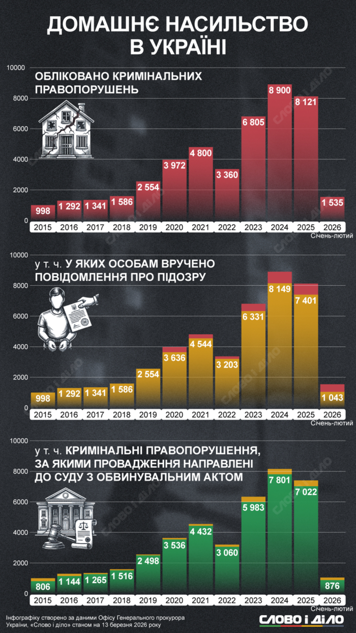 За підсумками 2025 року кількість справ дещо знизилася, склавши 8121 випадок. Однак висока інтенсивність зберігається і в поточному році: тільки за січень-лютий 2026 року правоохоронці вже зареєстрували 1535 правопорушень, з яких 876 проваджень дійшли до суду.